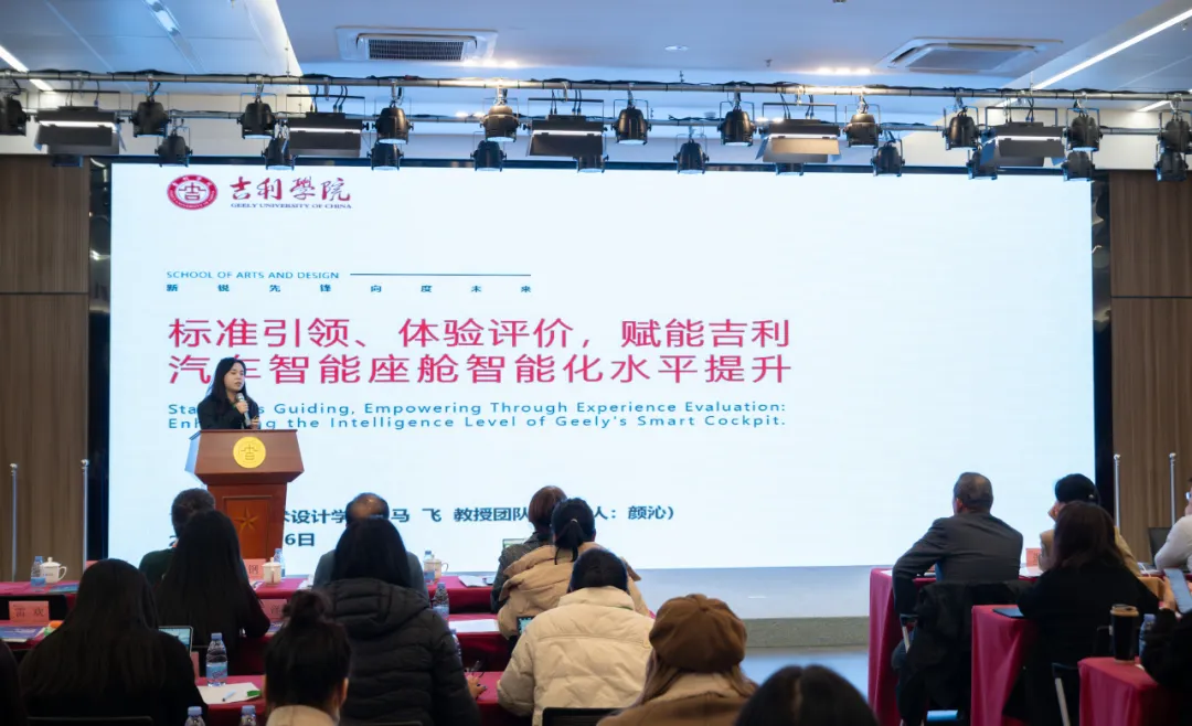 吉利学院颜沁老师作为艺术设计学院马飞院长团队代表发言:团队基于中汽学会团标,对10余款车型智能座舱进行多维度测评,发现国产车型在服务能力上表现突出,但语音交互、触控交互等仍需优化。研究成果为车企技术升级和2026年团标修订提供关键数据。
